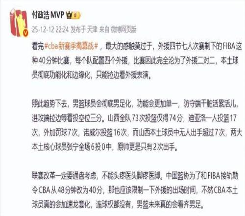 外援抢戏本土球员靠边站付政浩火力全开批篮协,苏群给出新思路