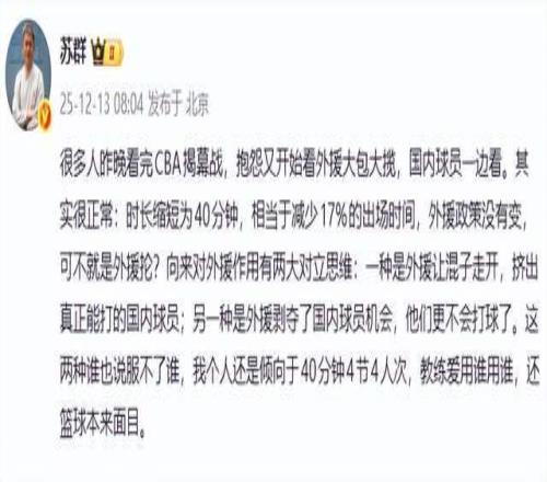 随后,苏群老师还给出了新的方向,“向来对外援作用有两大对立思维:一种是外援让混子走开,挤出真正能打的国内球员;另一种是外援剥夺了国内球员机会,他们更不会打球了。这两种谁也说服不了谁,我个人还是倾向于40分钟4节4人次,教练爱用谁用谁,还篮球本来面目。”
